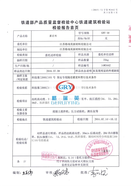此文關鍵詞:灌漿料檢驗報告,格瑞英檢驗報告