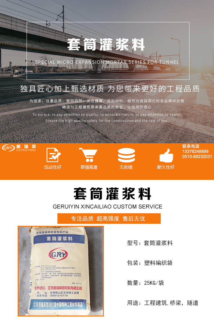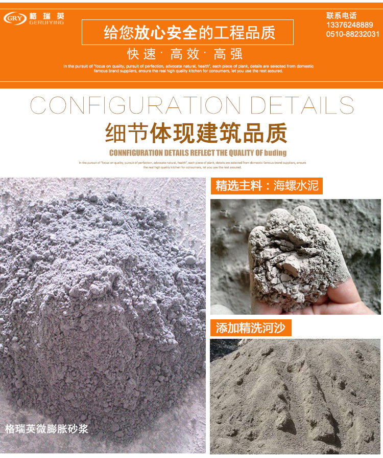 具有自流性好,快硬、早強、高強、無收縮、微膨脹;無毒、無害、耐老化、對水質(zhì)及周圍環(huán)境無污染,自密性好、防銹等特點。