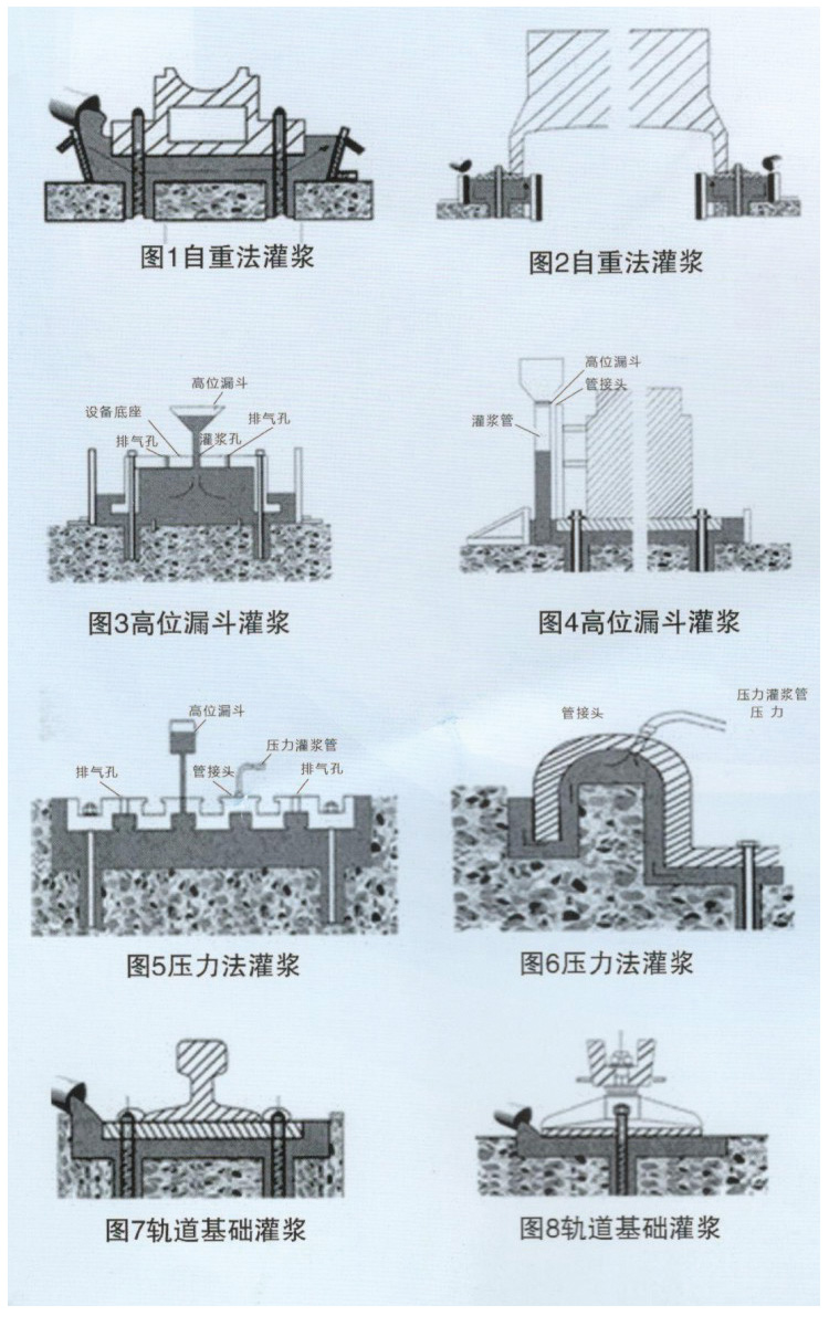 1)漿料應從一側灌入,直至另一側溢出為止,以利于排出設備機座與混凝土基礎之間的空氣,使灌漿充實,不得從四側同時進行灌漿。